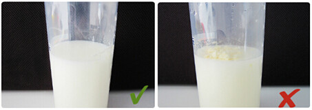 而不好的奶粉,會有小顆粒掛壁,甚至出現結塊的沉澱物,表明沒有充分溶解。