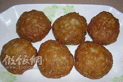 2、燒鍋下油,油溫130度下入大肉丸子,炸至外金黃內熟撈起待用。