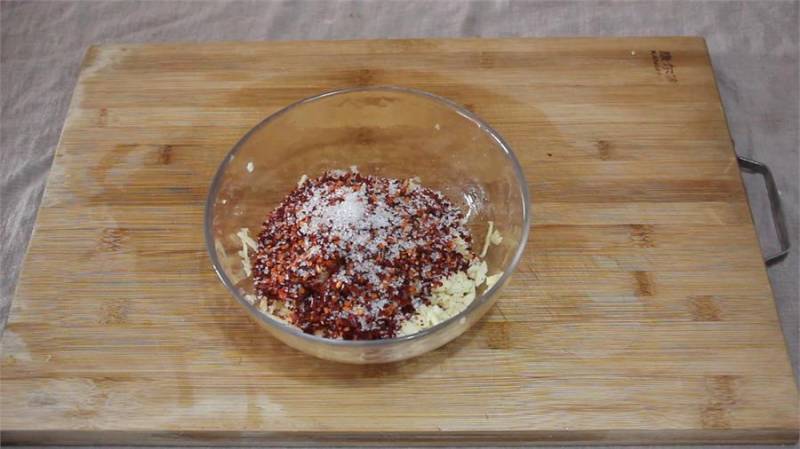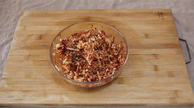 9.姜去皮,切絲剁成末,同樣裝入放蘋果絲的碗中。 10.倒入辣椒粉,加入4勺糖,攪拌均勻,放一邊等白菜醃制好。 11.6小時後白菜醃制好後,用手擰去白菜的水分,然後用燒開放涼的水沖洗下。 12.把調好的醬料倒入清洗好的白菜中,攪拌均勻,再冷藏個12小時,即可食用。 好了,今天這道辣白菜就做好了,喜歡的小夥伴可以試下哦,好吃得根本停不下來嘴。