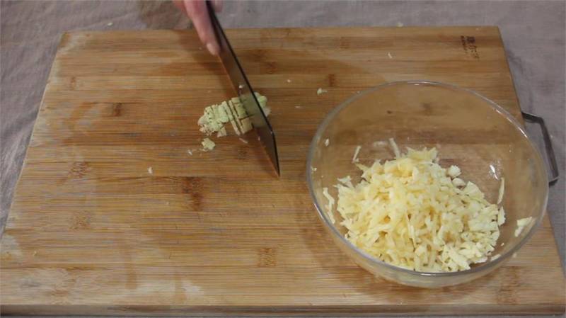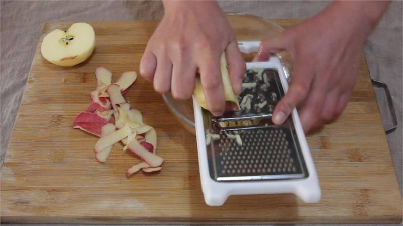 2.把白菜葉沖洗乾淨,切成圖中大小,裝入大盤子中。 3.加入5勺鹽,用手抓均勻。 6.封上保鮮膜,醃制6小時。 7.蘋果去皮,擦成絲,放入碗中。 8.蒜去皮,用刀壓下,剁成末,裝入放蘋果絲的碗中。