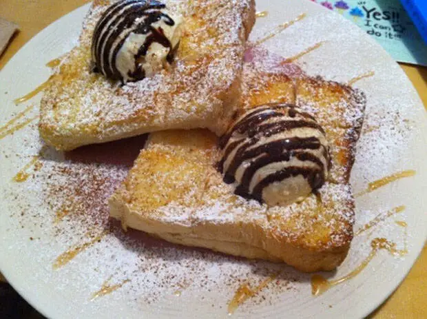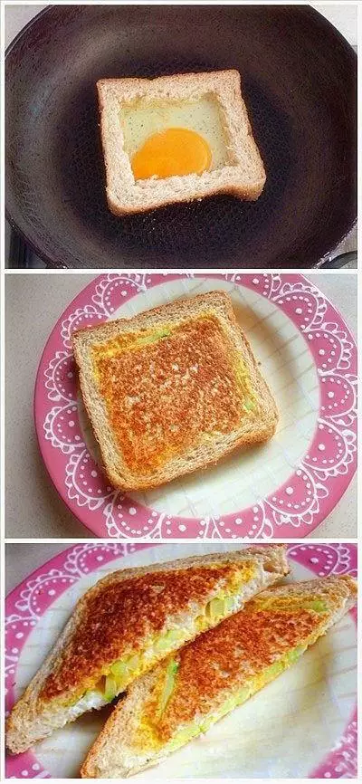 面包中間挖掉,打入蛋,加入黃瓜、芝士片、火腿等,烤熟後澆上番茄醬!