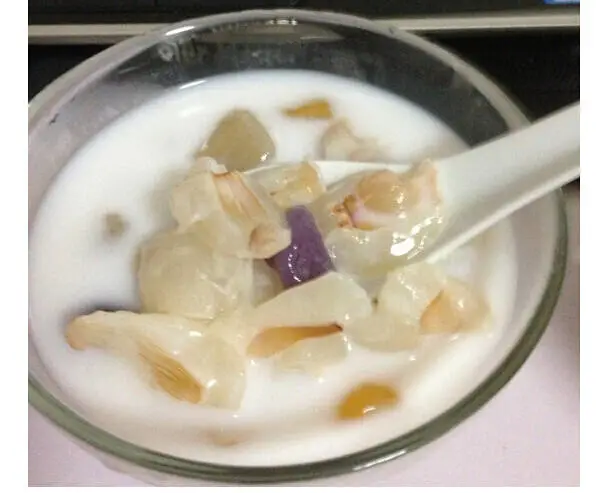 5椰子汁裡泡剝好皮的荔枝