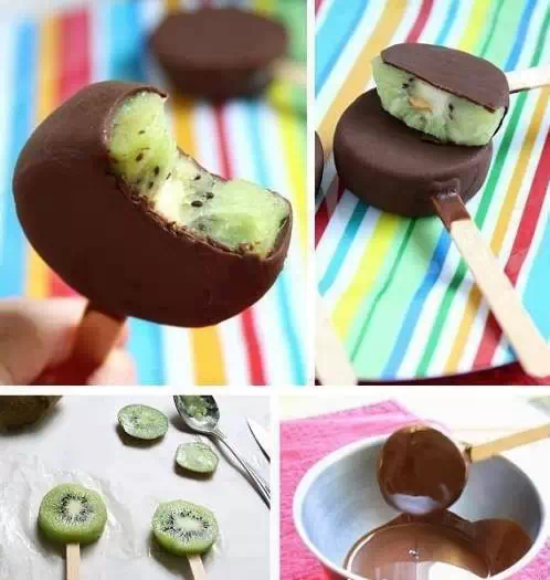 將獼猴桃切成片,然後裹上巧克力醬,入冰櫃冷凍,盡情享受美味吧!