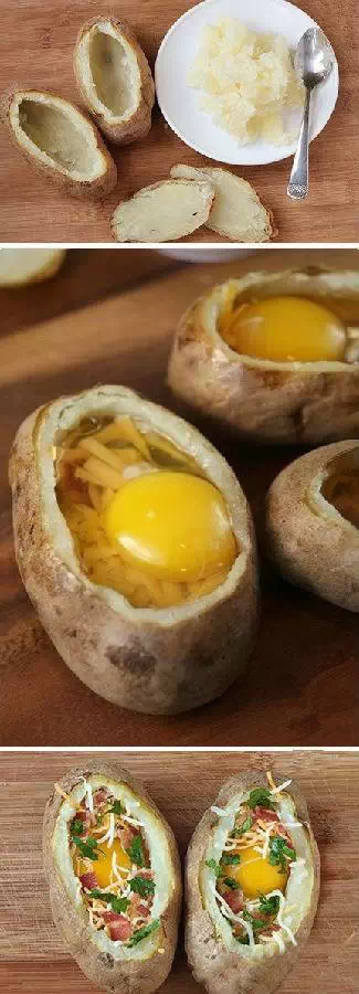 馬鈴薯洗淨蒸熟,挖空後塞點蔬菜培根之類的,打入一個雞蛋,放入烤箱烤熟!