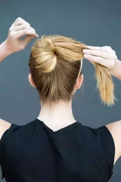 那整個髮尾部分用皮筋固定好,如圖所示,然後把頭髮向兩側拉成一個花苞形,用卡子固定好就完成了,很簡單實用的一款。
