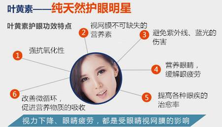 葉黃素經人體作用後可有效過濾紫外線和藍紫光,緩解眼疲勞,降低青光眼、近視眼、老花眼、白內障、散光等眼部疾病的發生率,提高治療率。菠菜、枸杞等食物中含有葉黃素,但易被氧化,人體吸收率低。眼部疾病患者、眼疲勞等人群可適當服用高純度的葉黃素酯。