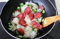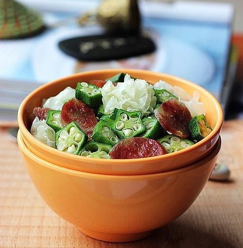 有一部分南方的朋友們估計沒有見過它,作為植物的它真是渾身是寶,吃它可以瘦身,美白,抗癌,防衰老!它就是秋葵,吃過秋葵的朋友都知道,它的果實里有一種粘粘的液體,這種黏性液質正是它的精華,經常食用幫助消化、增強體力、保護肝臟、有利於胃腸健康。多吃吃,你也可以吃出窈窕的身姿,紅潤的臉色~ 秋葵功效說明: 秋葵嫩莢含有豐富的果膠、膳食纖維,其果膠的粘稠狀態是植物界非常少見的,膳食纖維的佔比及其中可溶性膳食纖維佔比均是植物中非常高的, 所以秋葵具有減肥、清腸的神奇作用。它還含豐富的維生素C和可溶性纖維,不僅對皮膚具有保健作用,且能使皮膚美白、細嫩。新鮮的秋葵最適合在夏秋季食用,又美味又健康! 材料:秋葵250g、臘腸100g、銀耳10g、油1大勺、鹽1小勺 做法: 1.準備好材料,先將銀耳放水中浸泡半天。 2.清洗掉泥沙后,並把根蒂去掉,撕成小朵 3.臘腸清洗一下,放鍋中蒸20分鐘,放涼后,將臘腸切成小片 4.秋葵清洗乾淨后,切成片,蒜切片、蔥姜切末備用 5.鍋中水燒開,將銀耳放入水中焯熟,撈出瀝干 6.鍋中放一大勺油,油熱後下蔥姜蒜爆香 7.將秋葵下鍋翻炒,加入一小勺鹽,繼續翻炒 8.然後加入焯熟的銀耳並翻炒均勻 9.最後加入臘腸翻炒均勻即可出鍋。